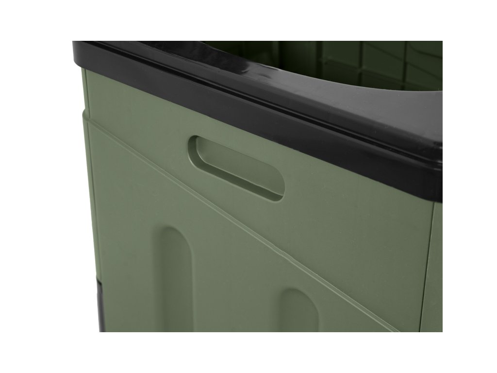 Design toalety se vyznačuje kombinací zelené a černé barvy, které dokonale zapadnou do okolního přírodního prostředí a zároveň do vaší rybářské výbavy.