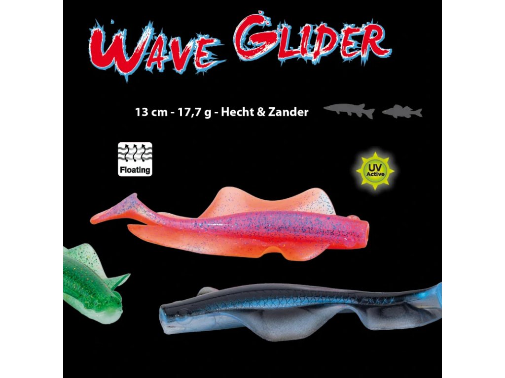 Wave Glider je revoluční umělá nástraha, která oslovuje všechny smysly dravců a spouští jejich žravý reflex. Na silně prochytávaných vodách už ryby viděly opravdu hodně a bývají podezřívavé – právě tady Wave Glider vyniká. Jemné impulzy vysílá pomocí souvislých bočních „ploutví“, které jsou v pohybu i při těch nejmenších fázích propadu. Tyto signály zasahují postranní čáru dravců výraznou intenzitou a často je donutí ztratit veškerou ostražitost. Kombinace kopytového ocasu a pulzujících bočních „ploutví“ je navíc výborná i pro noční přívlač, protože vytváří silnou tlakovou vlnu.
