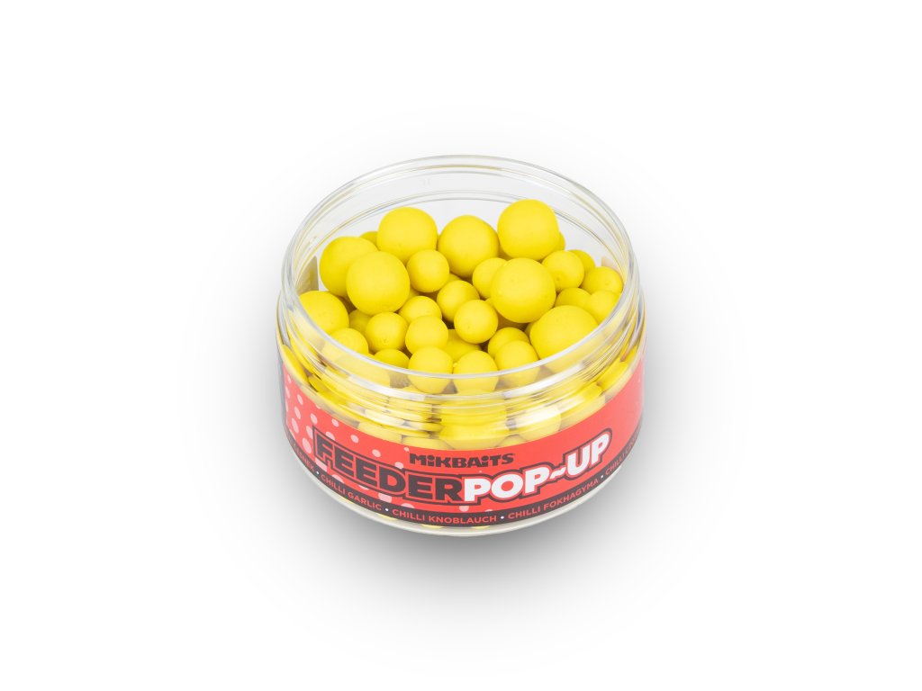 Feeder pop-up Chilli Česnek jsou nesmírně atraktivní plovoucí fluo nástrahy. V balení jsou dva průměry 8 a 12 mm, abyste se mohli u vody přizpůsobit situaci.Jsou skvělé na feeder, method feeder, krátkodobý lov, závodní chytání, při slabé aktivitě ryb nebo na velmi opatrné ryby. Podle velikosti použitého háčku se buď vznáší jen nad ním na vlasovém přívěsu (či zavrtáváku, zapichováku), s velmi malým háčkem mohou zvednout i návazec. Lze je též kombinovat s potápivým boilie stejného průměru „na panáčka“. Dají se požít celoročně, včetně velmi chladné vody.